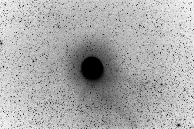 10分露光で撮影してそのままではわからなかったのですが、強い画像処理を掛けてみると「尾かな?」という感じで辛うじて右下(南東)側にモヤモヤしたものが写りました。(写真はよりわかりやすくするために白黒を反転しています。)