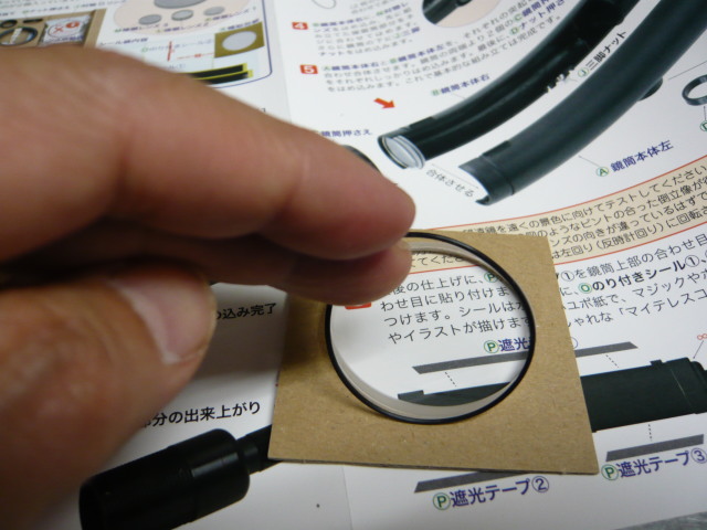 ボール紙に対物レンズがスッポリ入る穴が開いている