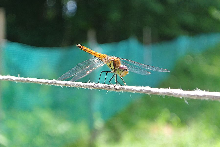 涼しい日が続いているせいかどうかわかりませんが、今日は畑の 害獣避け柵で羽を休めているトンボを見つけました。