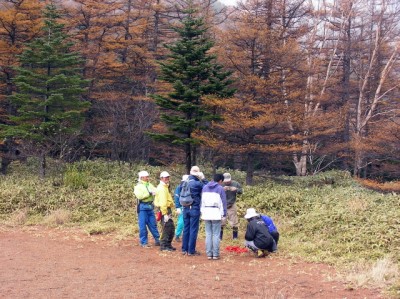 具体的には迷子にならないようにコースの道々に目印のリボンを付けて、目線の高さに伸びた枝を落として、安全にコースを回れるようにしました。この時期は隈笹が生茂っていて、ほとんど獣道状態でしたが山歩きになれたメンバーが先導してくれて作業をすることができました。