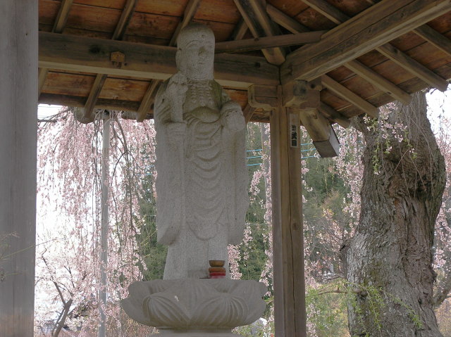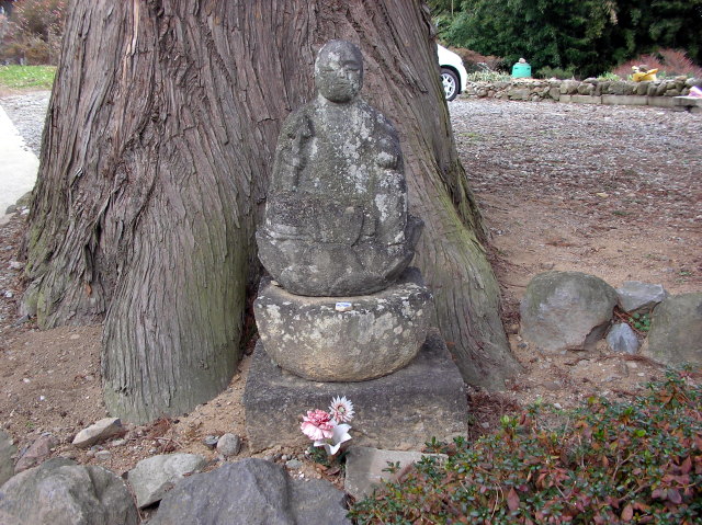 道喜院というお寺の境内はそれほど広くないのですけれど、あちこちにいろいろな仏像があって印象的です。中でもこの民話の地蔵尊と思しき石仏は屋根付きの東屋に祀られています。