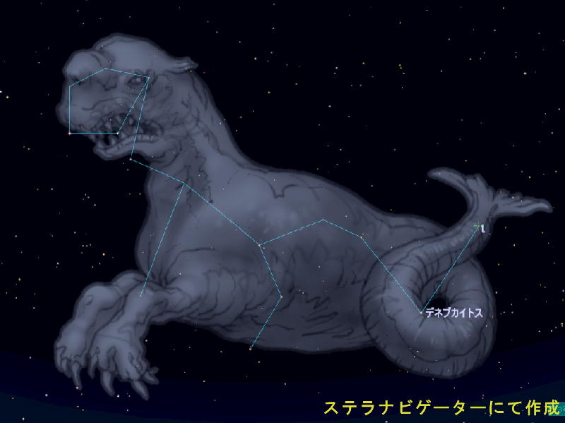 このクジラの尻尾の付け根あたりにはデネブカイトス(クジラの尻尾)という固有名の2等星があるのですが、星座絵的にはそこから跳ね上がるようにもう一つι(イオタ)星があって、現在の星座の区切りではそこが終点になっています。