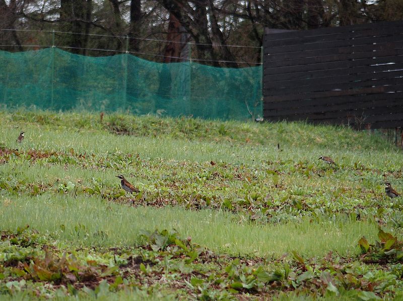 冬のあいだ単独行動だったツグミが20羽近い群れで行動していました。
