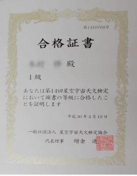 さて3月末に三鷹で受験した「星検」(正式には星空宇宙天文検定)ですが、おかげさまで合格し合格証書が送られてきました。
