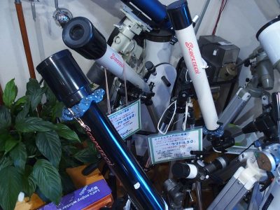販売用の見本でもあるのですが、気軽に望遠鏡に触れて頂き使って頂けるように貸出用望遠鏡の一角をなしているのです。