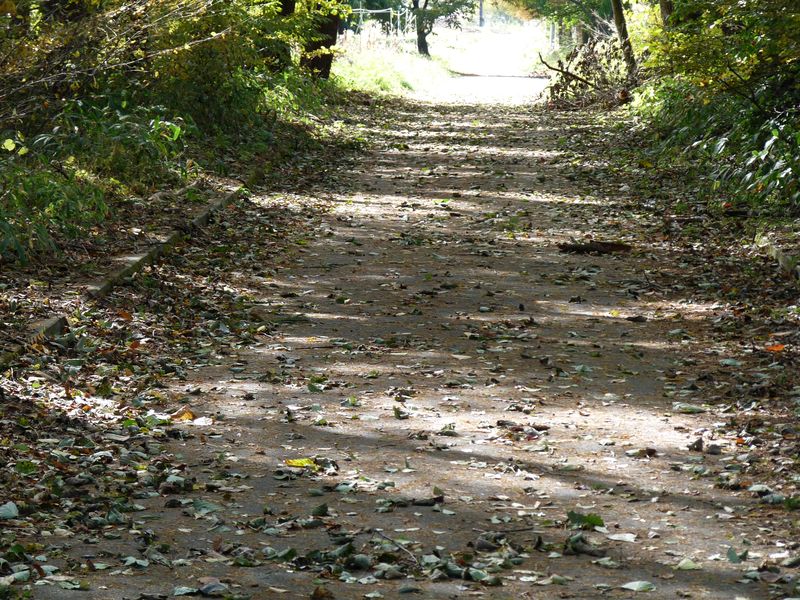 林の中の道路は、路面が見えないほど落ち葉が敷き詰められています。