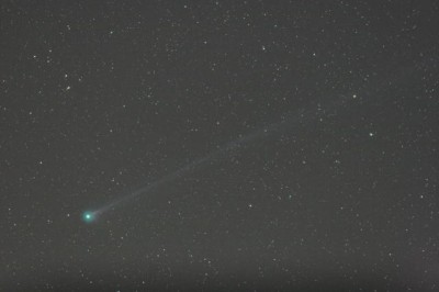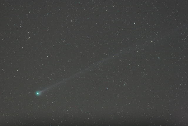 ポイマンスキー彗星は望遠鏡で見ると「辛うじて尾があるかどうか・・・?」というふうにしか見えないのですが、写真に撮るとビックリするほど長い一直線の美しい尾が写ります。(写真は昨晩、自然観察家のSさんがスタパの設備で撮影したものです。)