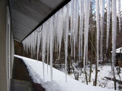雪のおかげ(?)で、北側の軒下にはツララが