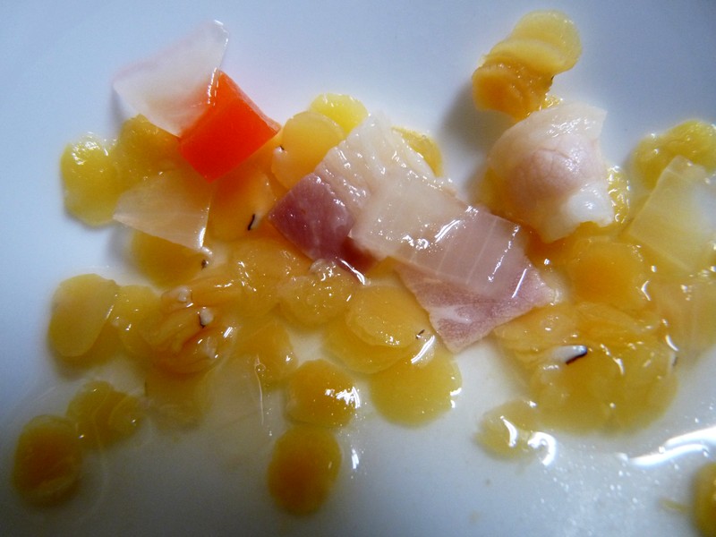 薄オレンジ色で直径5mmくらいのレンズ状の豆です。(写真はあまり美味しそうに