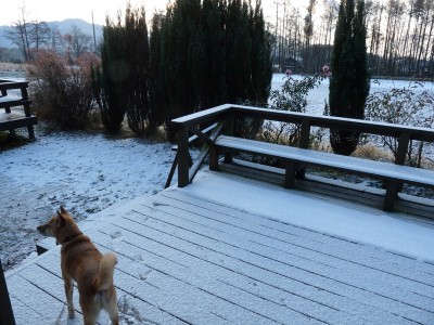 今朝起きると、またもやうっすらと積雪。