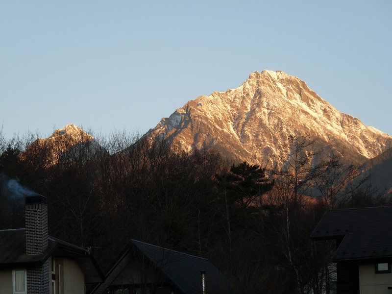 いつもとはずいぶん違った風景にお目にかかれて感動したりします。 (写真はスタパの煙突の向こうに見える朝焼けの八ヶ岳主峰、赤岳です。)