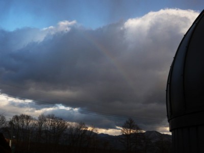 雪の融けた畑から湯気は立ち登るは、夕方には虹が