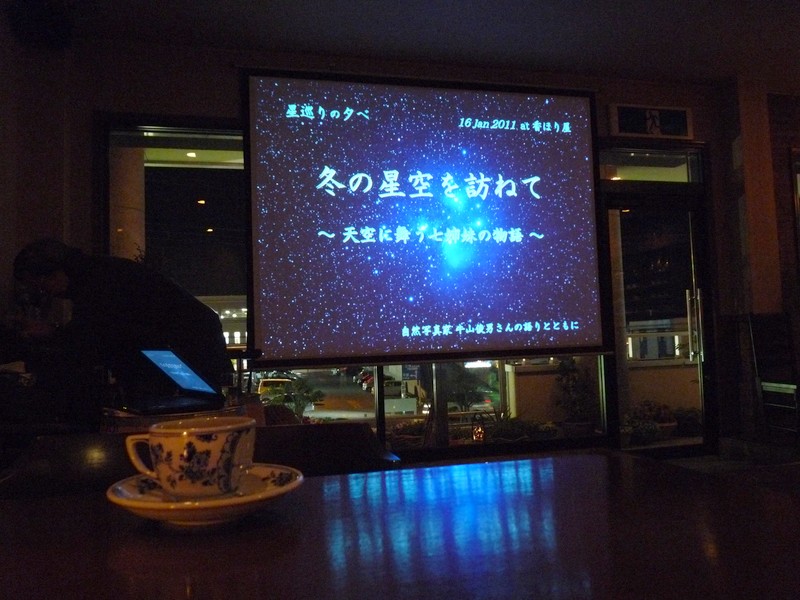 さて、今夜は月に一度の自然写真家 牛山俊男さんの星巡りの夕べがあり、