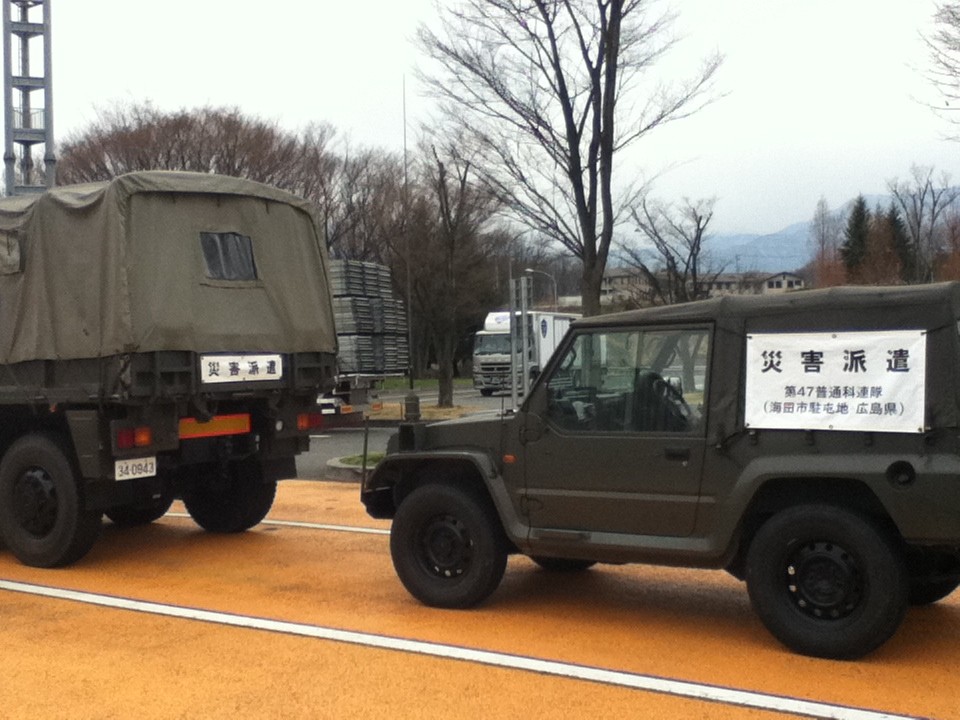 途中の高速道路やサービスエリアには自衛隊の災害支援部隊の車が