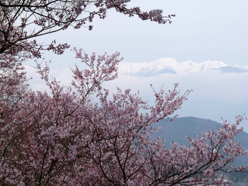 高遠城趾は桜の向こうに雪をかぶった日本アルプスの山々が見られて、眺めが