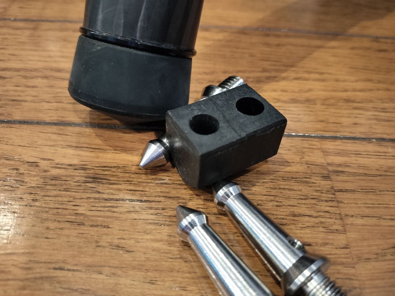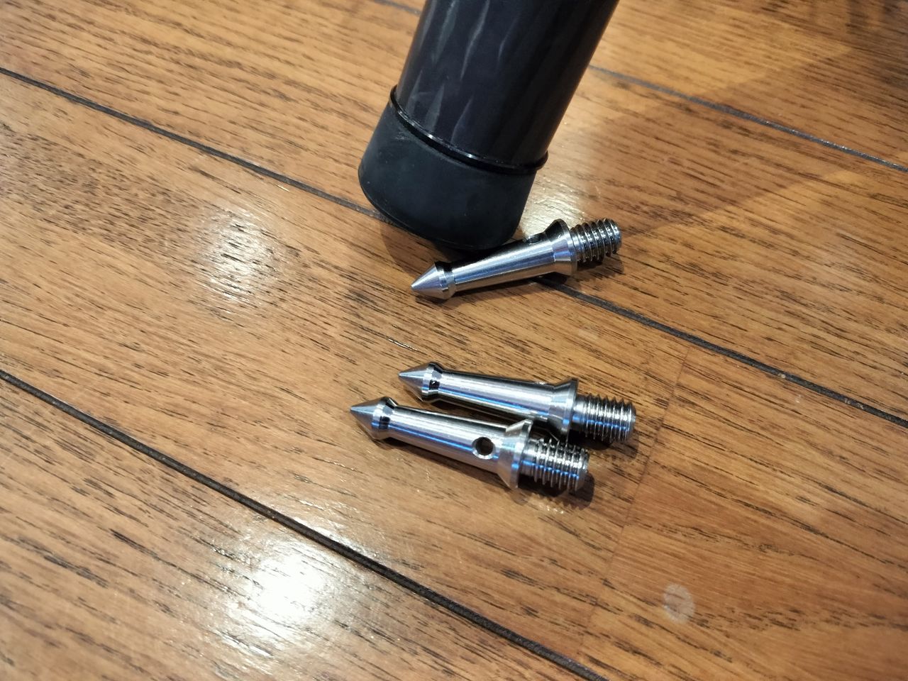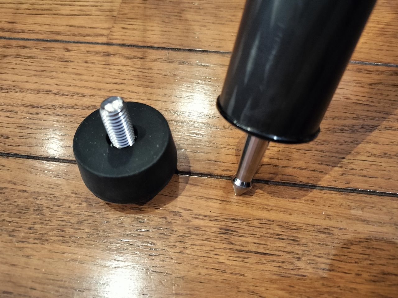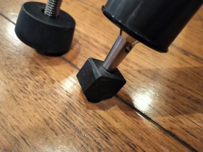 ゴム足のままだと実際に使用するときにわずかな振動が発生するような気がするので、ガッチリ設置するためには金属製の石突きに交換したいところです