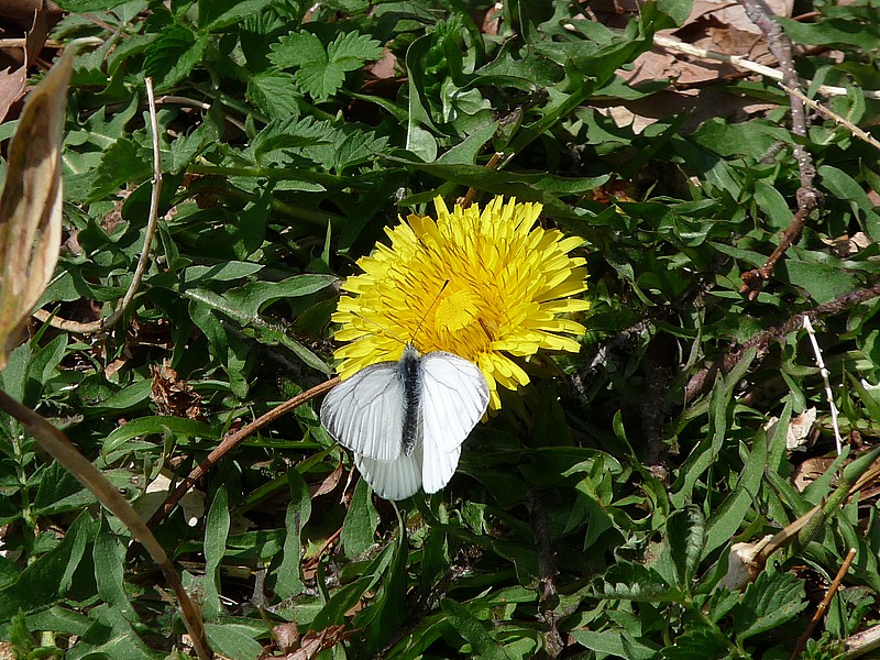 気の早いチョウチョがタンポポの花をいったり来たりしています。