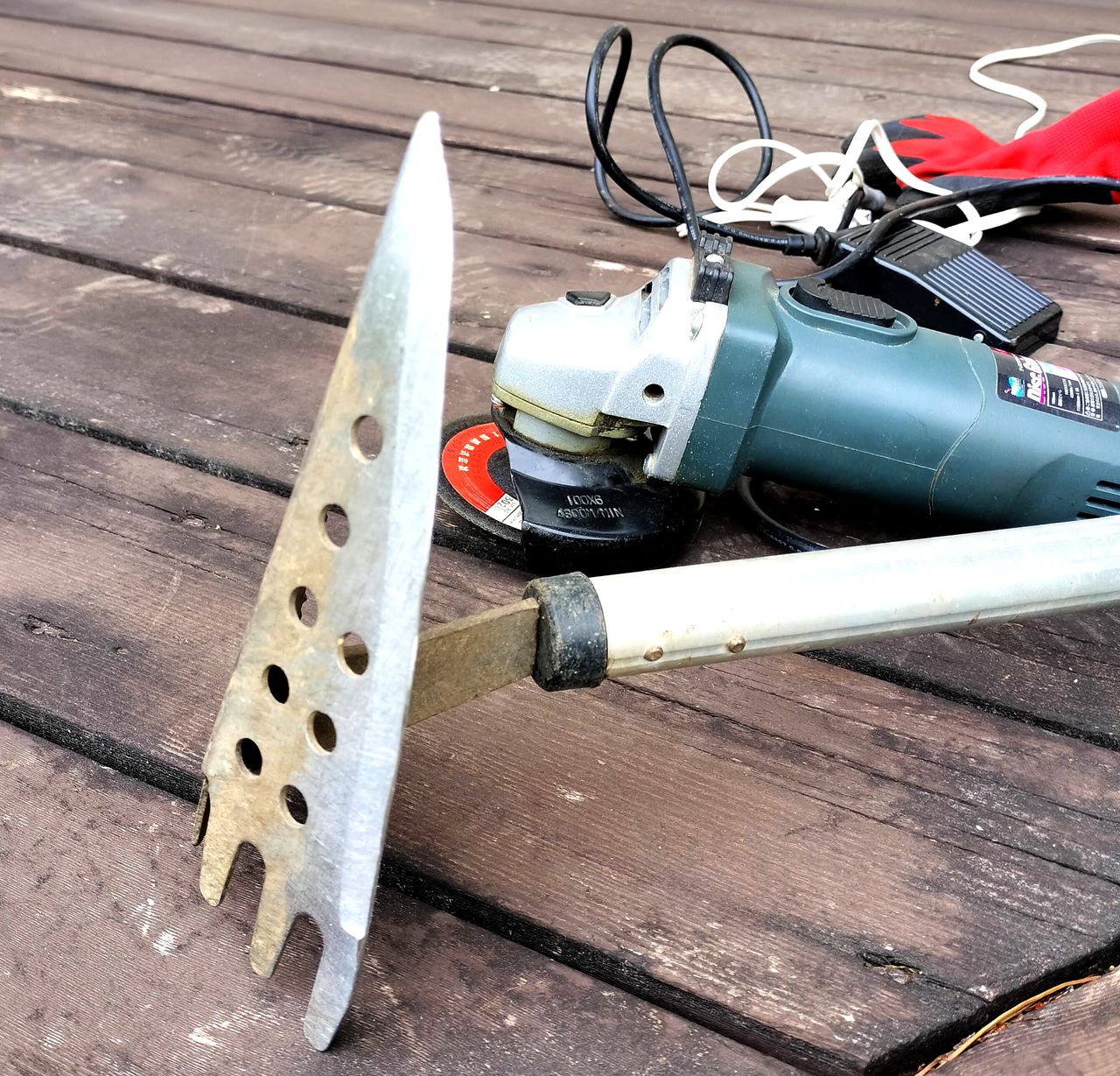 上の三角ホー少し前に購入したのですが刃がへたって最近出番が少なかったのですが、ディスクグラインダーで目立てをして復活しました