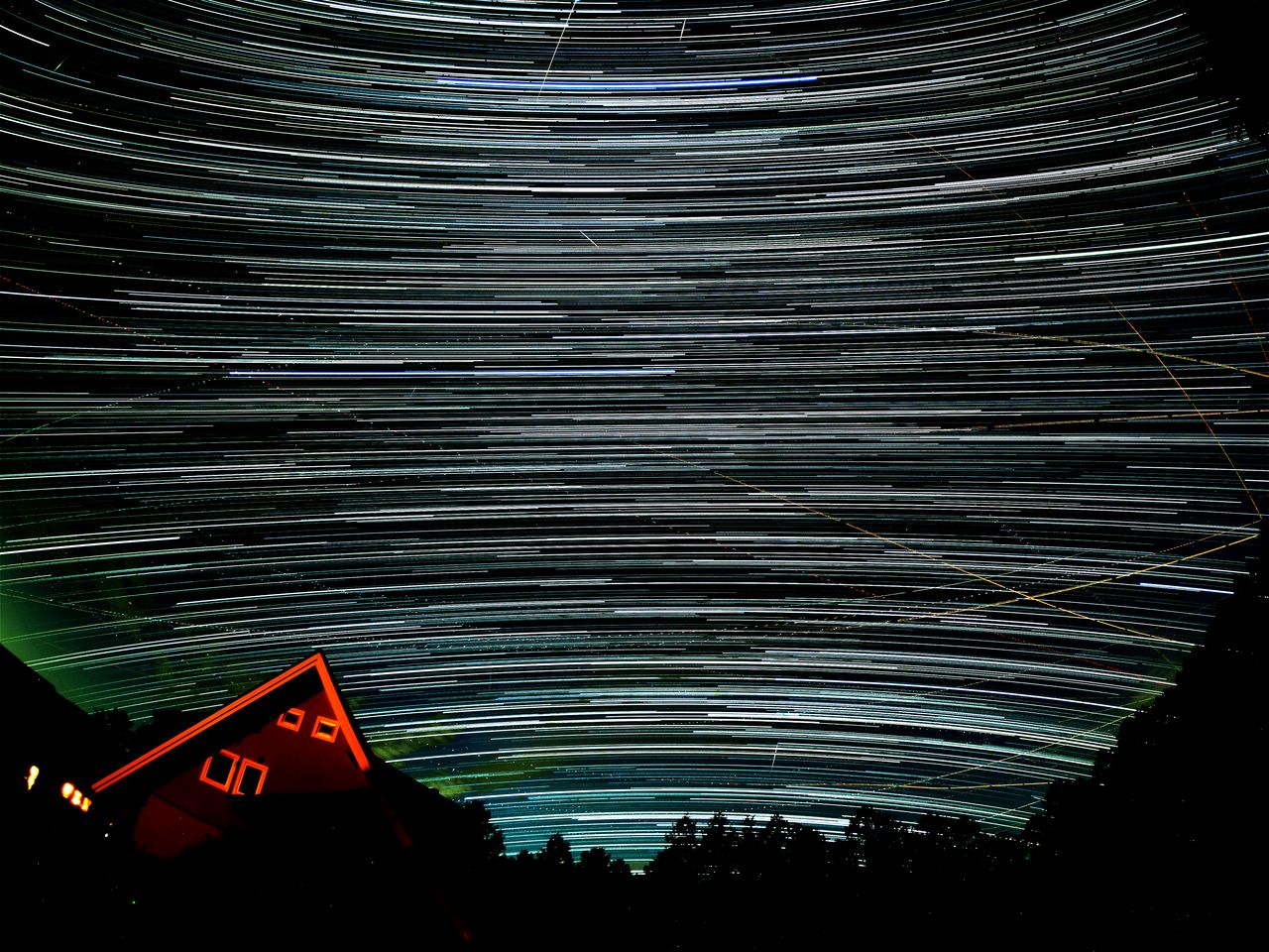 上はほぼ東を向けた画像ですが、真東から昇る星は地平線に対して約55度の角度の軌跡をたどります