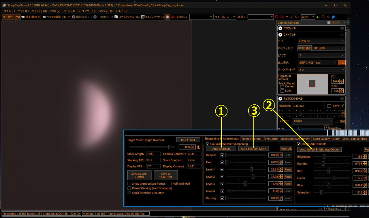 SharpCapは月や惑星(太陽も)を撮影するのにスタックからウエーブレット処理までできてしまうので、従来の幾つものアプリを組合わせて画像を作る手法に戻れなくなっています