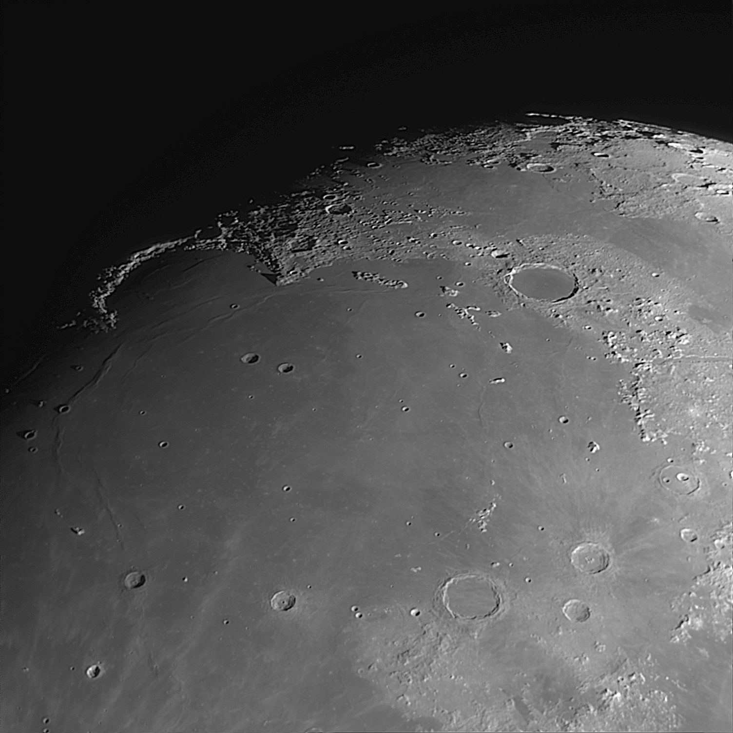 昨晩月の撮影をしているとき、虹の入り江(写真右上の半円形のクレーター)がとても綺麗だったので思わず拡大撮影をしてみました