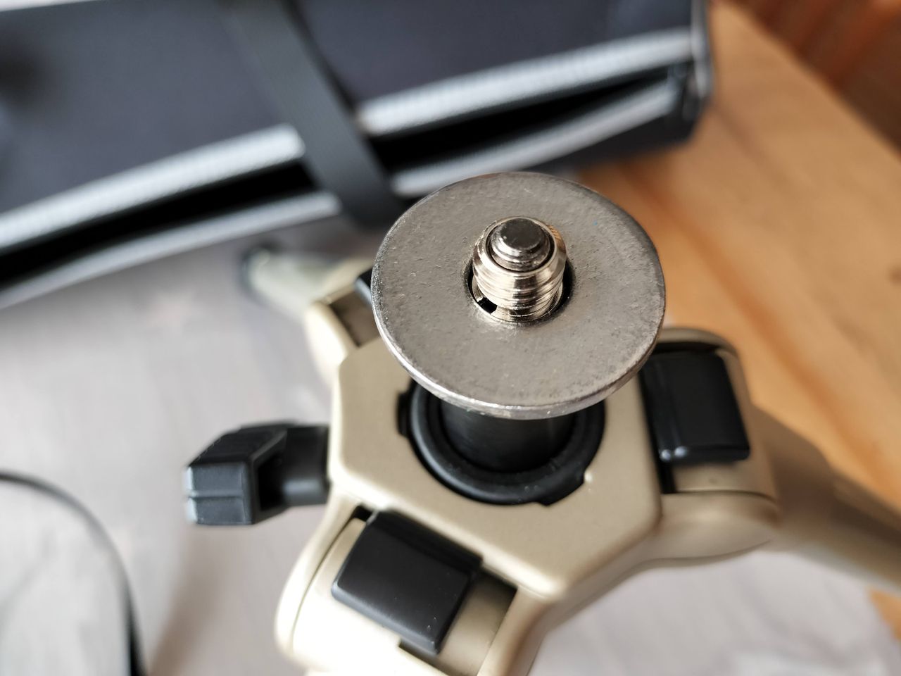 トラバースの取付けは3/8インチなのでコンパクト型の一般的カメラ三脚に取り付けるときは 3/8→1/4インチ変換アダプターが必要になります