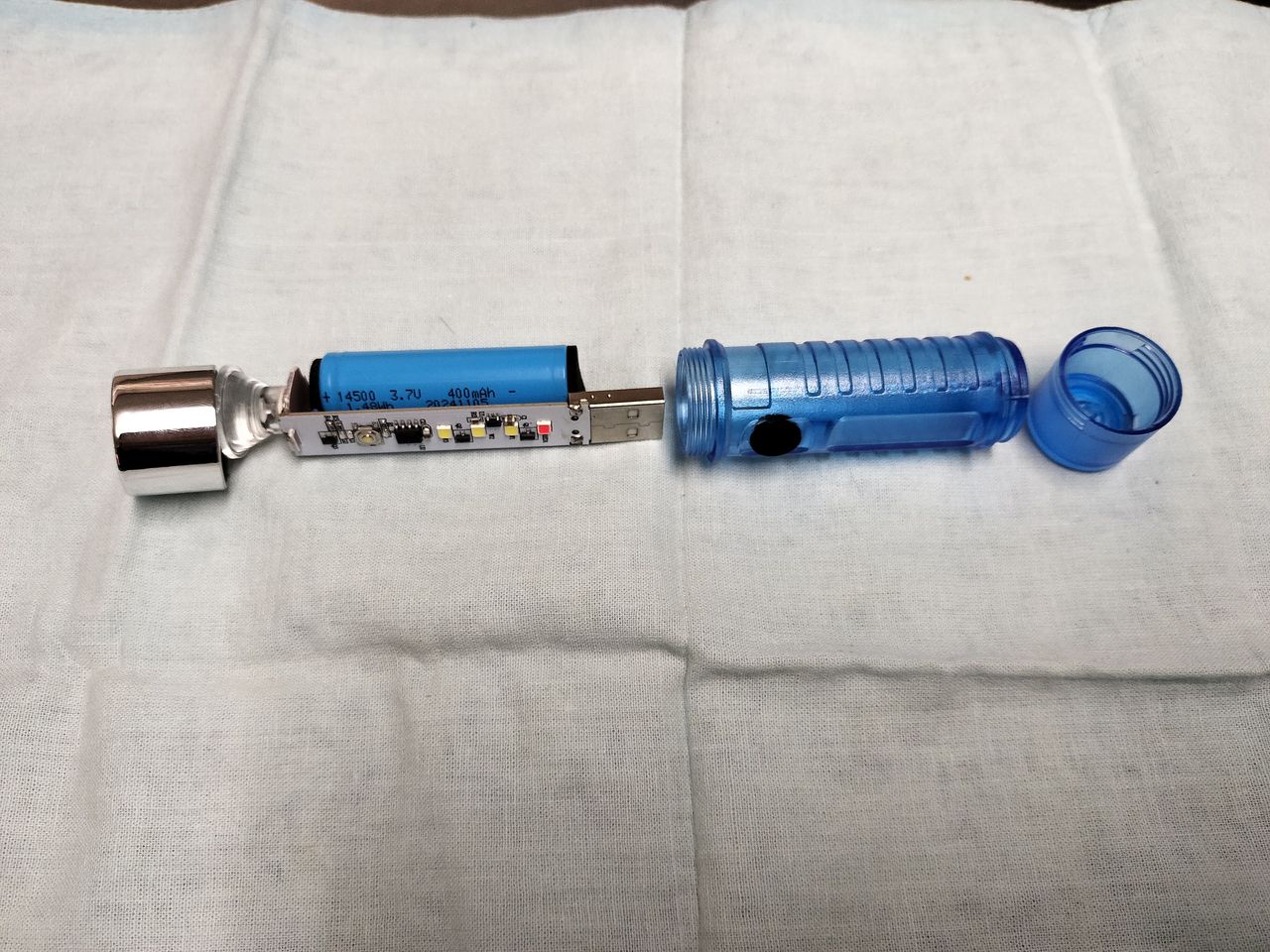 充電式のライトですがUSBに直接さし込んで充電できるようになっていますが、両端の部品のネジを廻して外したあとUSB端子をグイッと押すと上のように分解できます