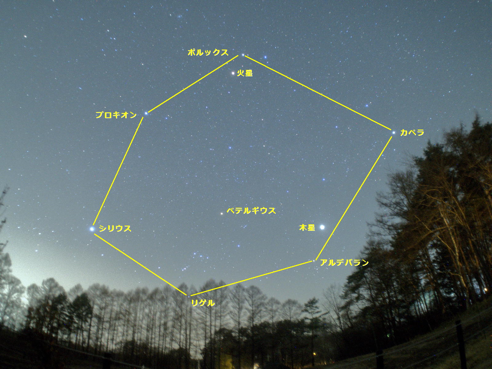 星座の世界では宵の口ににぎやかな冬の星座たちが大きく西の空に傾いています