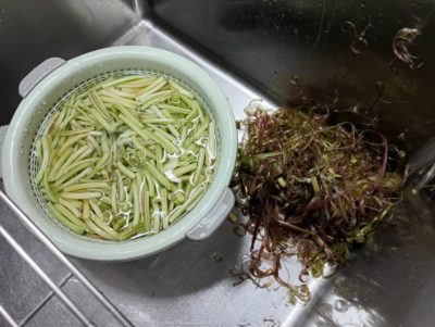 サツマイモの地上部分(葉っぱや茎)は残渣として土に返すように処理するのですが、葉の茎の部分は少しだけ取り分けて食べることにします