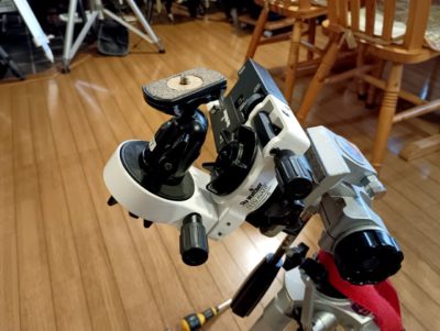 AZ-EQをカメラ三脚に取り付け、赤緯体のカメラネジに自由雲台を取付ます