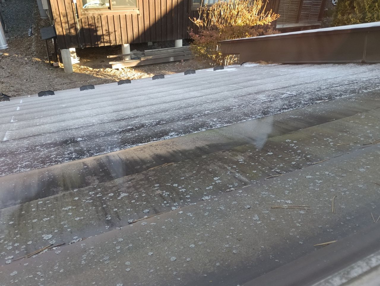 今朝おきると屋根が霜+舞った雪で真っ白になっていました