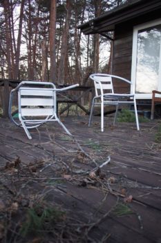 ウッドデッキの上が風で落ちた枯枝とマツボックリだらけ
