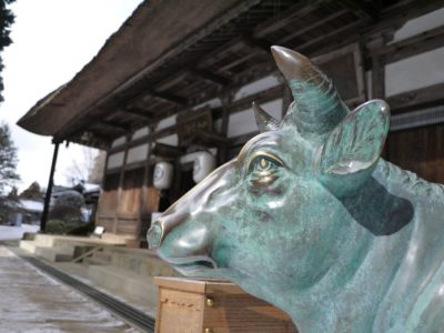 その名にちなんで伏せた牛が狛犬の代わりをしています