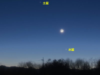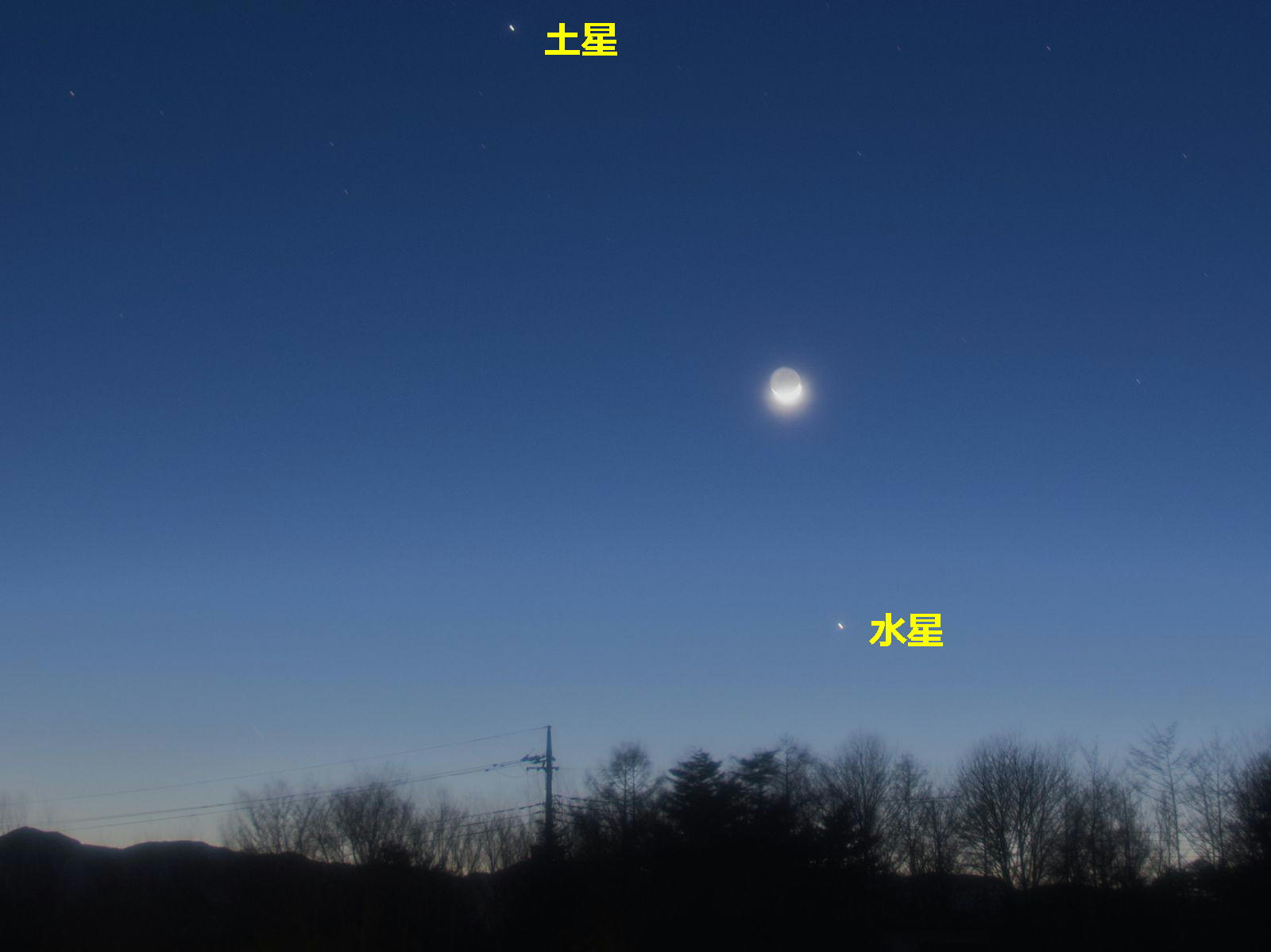 金星は日没後すぐに沈んでしまい、薄明の中に微かにわかる程度にしか写真に写らなかったのであきらめ、水星と土星が良く見える写真をアップしています