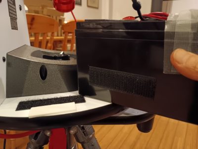 写真のように鏡筒先端寄りの架台テーブル上にバッテリーを置くと配線の取り回しが良いのですが不安定なのでベルクロ(マジックテープ)で仮止めできるようにしました