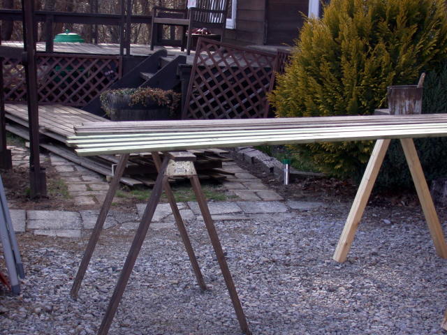 本来ならばこの3年の間にしっかり儲けて、立派なデッキを作り直す予定だったのですが、耐久性を考えた材料を使って作ろうとしたら60万円以上掛かりそうなので、思い切りくじけてしまい「あと3年持てばいい」ということで、今回は床材だけ張りかえることにしました。
