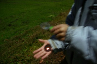 大きな虫眼鏡で月光を集めて、手のひらに焦点を結ばせます。