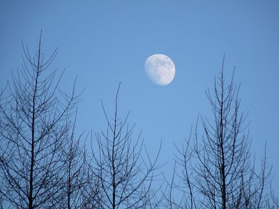 夕方にはすっかり葉を落としたカラマツの梢に月が昇って印象的でした。