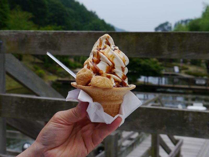 ソフトクリームに黒蜜ときな粉がトッピングされ、甲州名物「信玄餅」が