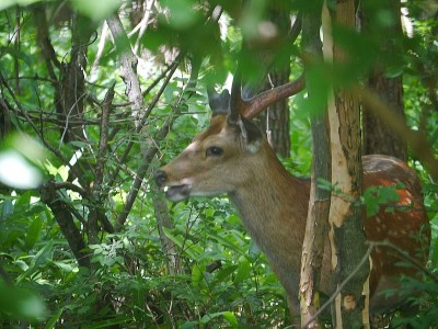 りっぱな角がはえたシカさんが木の皮をムシャムシャ食べていました。