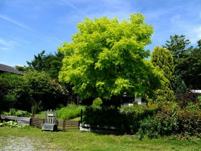 これスタパのお隣に植えられている木なのですが、日が当たるとライムグリーンの